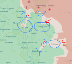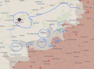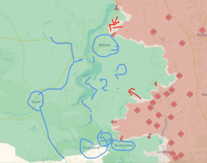 Likewise, further south of the pocket, Russia continues to press toward Borova (which did appear on the radar of Yours Truly as a goal for Russia some two years ago). Progress has remained slow, but further south Russian forces have also driven west just north of Yarova. The Borova-to-Yarova pocket is an obviously a very large area, and Russia will have a hard task taking this over, but it poses a looming danger for Ukraine in that lines of retreat are blocked by the Oskil itself, and if Russia takes the Yarova and nearby towns, it will be set to create a pocket that will be important for Ukraine to defend, but increasingly difficult to supply or escape.