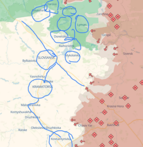 The obvious, but also desperate play for Ukraine is to hold the line here for as long as possible and then fall back to fortified positions beyond (more on that later). Noteworthy is that Lyman is also still holding out (and this should be included in the Yarova cities/towns that are key to stopping not only the creating of a true Borova-Yarova pocket, but also to preventing or slowing the Russian targeting of Sloviansk). Russia may have at least for now bitten off more than it can chew, however, as this is not easy terrain, and they will be plagued with wetter and wetter ground, lakes, creeks, rivers, bogs (basically east of Lyman is a flood plain), dense forests and the like.