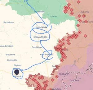 Now a few explanations re the "artwork" of Yours Truly. First, note the below the disrupted line between Pokrovsk and Konstiatynivka. Second, note the two-pronged Russian attack north of Pokrovsk, the Ukrainian Azovs who cut off the more northern Russian troops, but also the pressure on Pokrovsk itself.